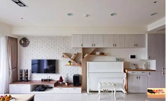 ▲非常简洁的一款电视背景墙设计,白色的文化砖搭配大面积的收纳柜,墙面一侧还设计了一个具有装饰性的树型置物架,空间整体又时尚。